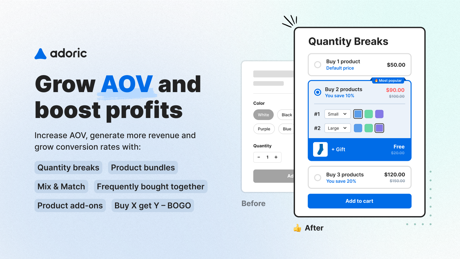 The hardest sale is the first one. Once someone is buying, the cost to add more is near zero. Quantity breaks, mix & match bundles, and frequently bought together widgets turn single-item carts into multi-item orders โ€” automatically.