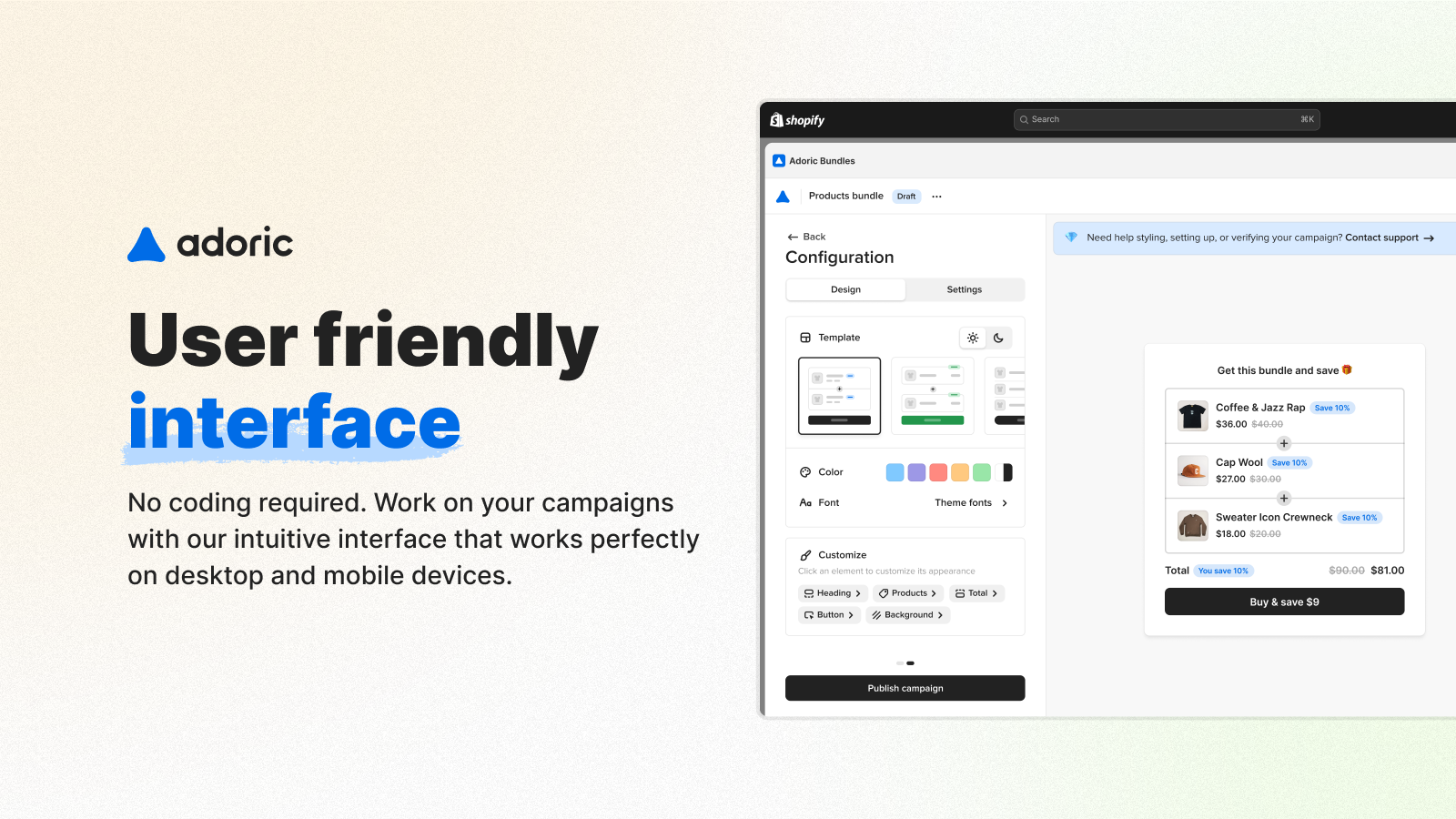 Adoric reads your Shopify theme and pre-fills your brand colors and fonts. Most merchants go from template to live campaign in under 2 minutes.