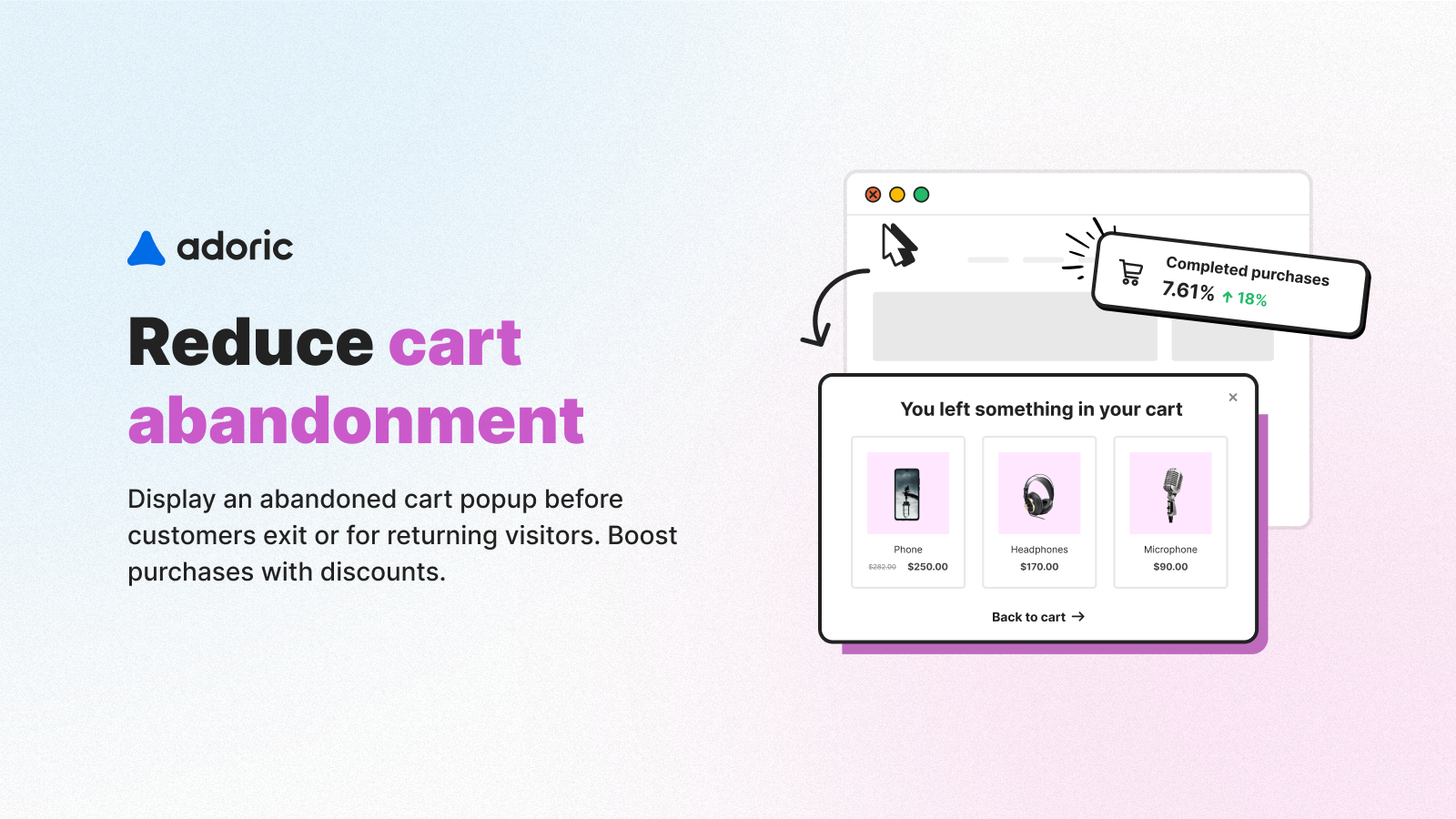 That gap is real revenue walking out the door every day. Adoric plugs every leak โ€” from first visit to post-purchase. Most stores close the gap within 7 days of installing.