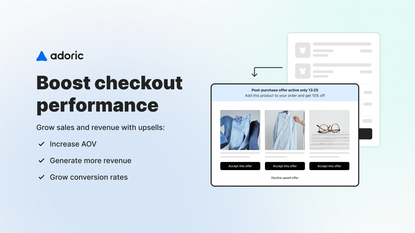 The order confirmation page has the highest purchase intent of any moment in the customer journey. One tap adds to the existing order โ€” no new checkout, no card re-entry. Most stores deploying this see it pay for their entire Adoric subscription in week one.